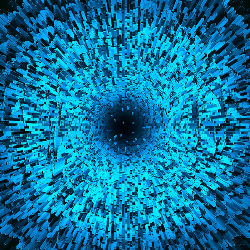 In his series titled Axis, swirling vortexes of light and color emerge from a dark ground. The printing methodology allows the image to move and change with the angle of vision. Jeon's works depict three-dimensional, imaginary spaces that morph and change, starting as one thing and becoming something else.